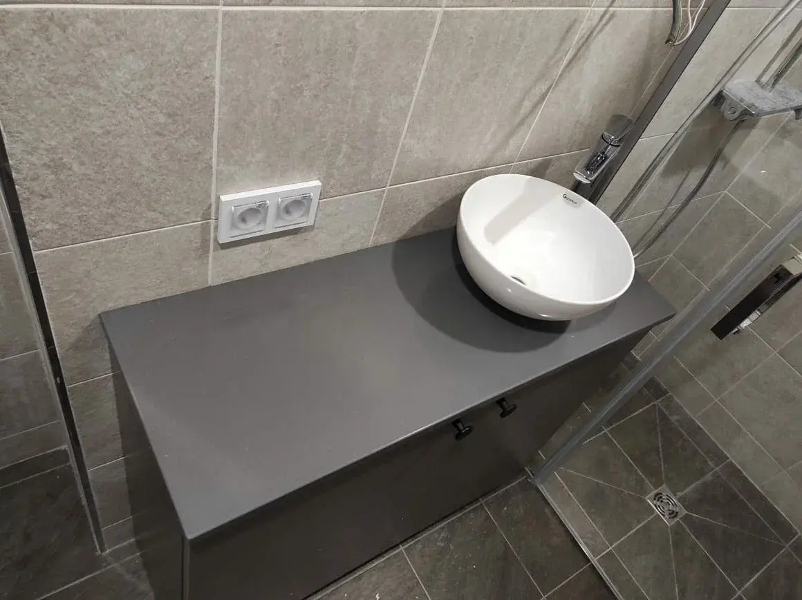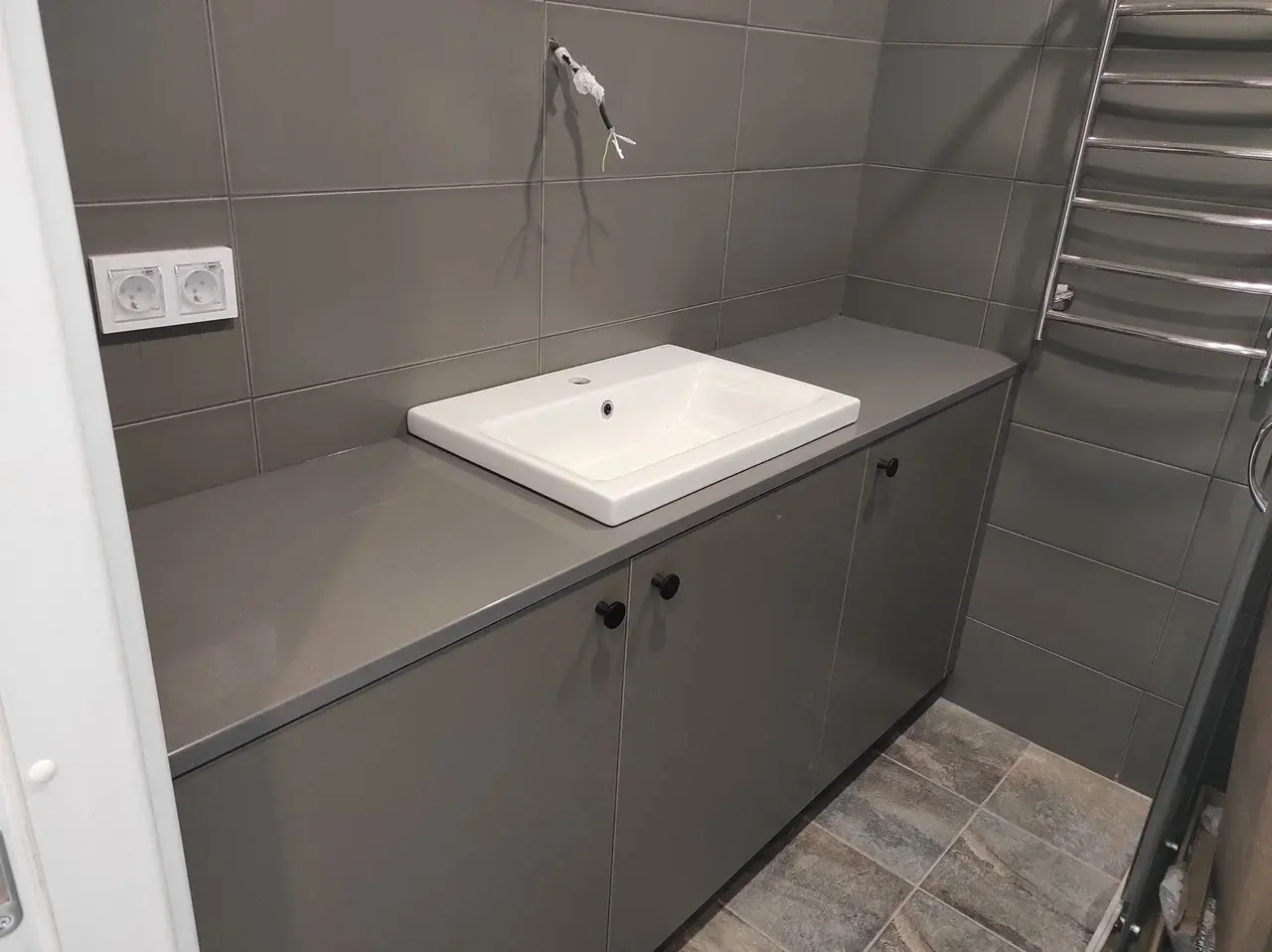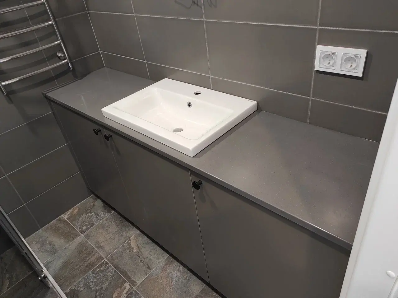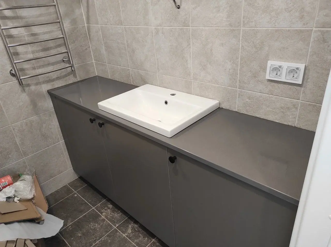 Прямая столешница из искусственного камня Opaly MX204 Canvas. Изготовлена в качестве выставочного образца в кухонном салоне
